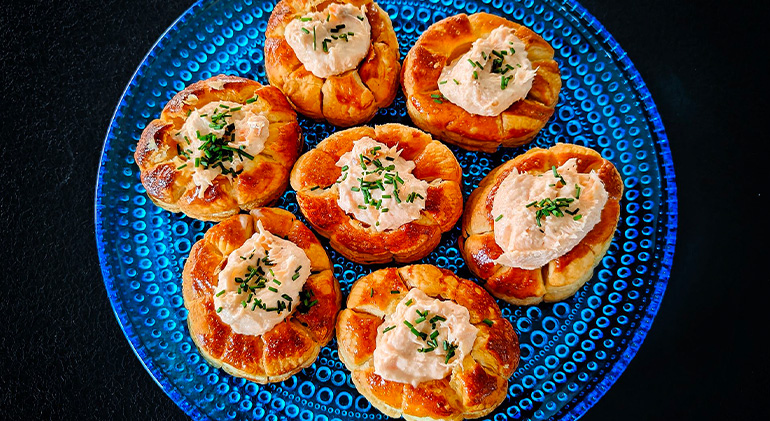 Suolaiset savulohipiiraat valmistuvat pöytään nopeasti 20 minuutissa. Valmiista voitaikinasta leikataan noin 10cm:n kokoisia ympyröitä, joiden reunoihin tehdään viiltoja keskustaa kohden. Lohipiirat paistetaan uunissa ja täytetään Kala-Lapin Legenda lämminsavukirjolohitartarilla. Lopputuloksen saadaan piiraita, jotka häviävät pöydästä alta aikayksikön. Suosittelen kokeilemaan!Sulata voitaikina ohjeen mukaan. Leikkaa voitaikinasta muotin avulle halkaisijaltaan 8-10cm:n kokoisia ympyröitä. Paina halkaisijaltaan noin 2-3cm:n muotilla ympyröiden keskelle painauma (ei pohjaan asti). Leikkaa veitsellä ulkoreunasta painaumaan saakka viiltoja (noin 8-10 kpl). Nostele tortut uunipellille leivinpaperin päälle. Sekoita kananmuna kupissa ja voitele joulutortut. Paista torttuja uunissa 225°C noin 12-15 minuuttia uunin keskiosassa.